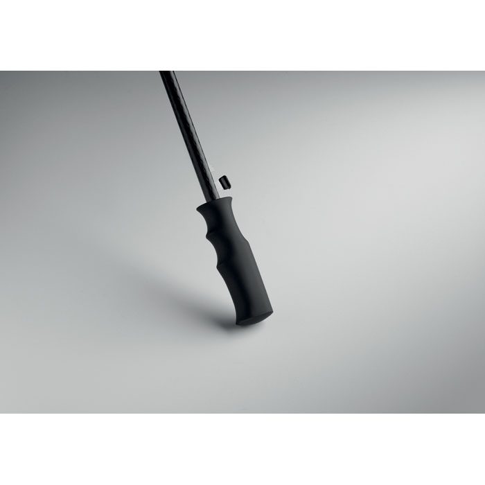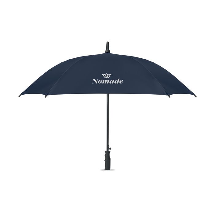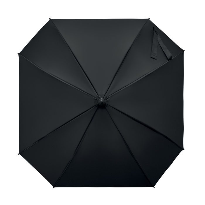 23-inch windproof auto-open square umbrella in 190T pongee polyester. Features full fibreglass frame and ribs, rubber-finished ABS handle.