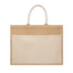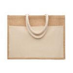 Shopping bag made of laminated jute and 280 gr/m² cotton canvas with cord handles. Includes large open front pocket.