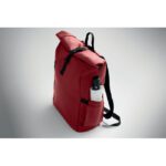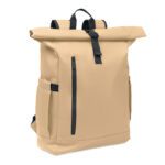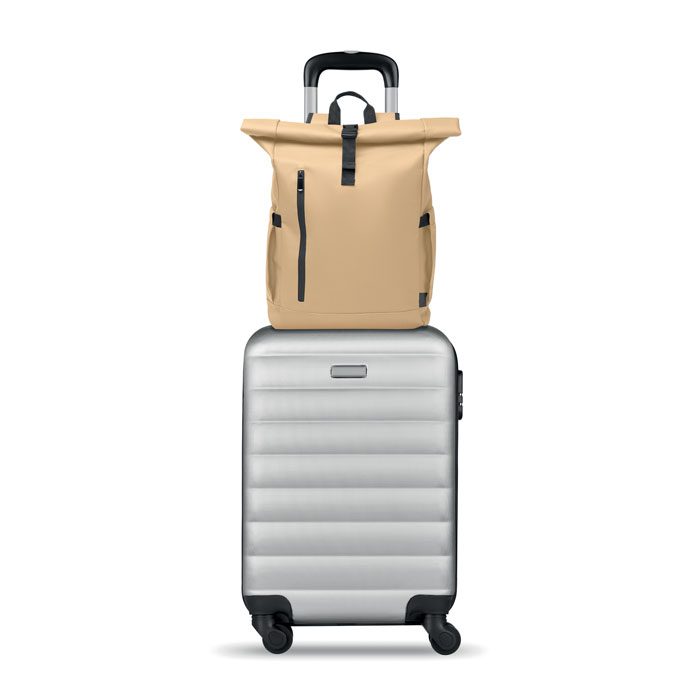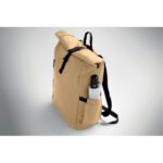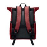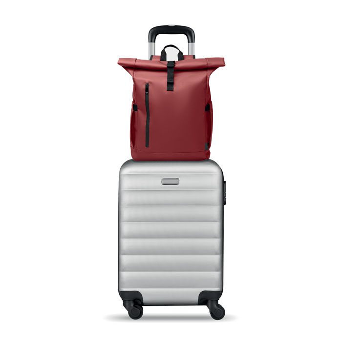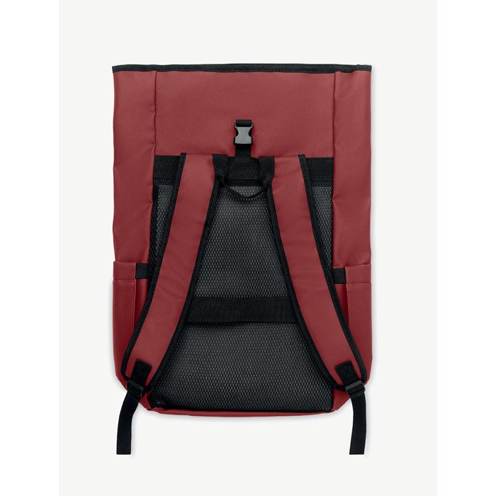Roll top 15 inch laptop backpack in PU coated 600D RPET polyester and RPET polyester lining. Meshed padded back with zippered pocket and trolley strap. Padded shoulder strap with mesh inside finishing.