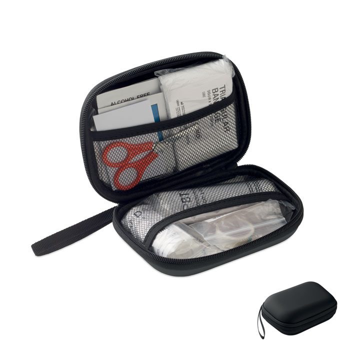 First aid kit in hard PU case. Includes 2 gloves, 1 blanket, 1 tape, 2 bandages, 1 scissors, 4 swabs, 10 plasters and 6 cleaning wipes. Not available for sale outside the EU.