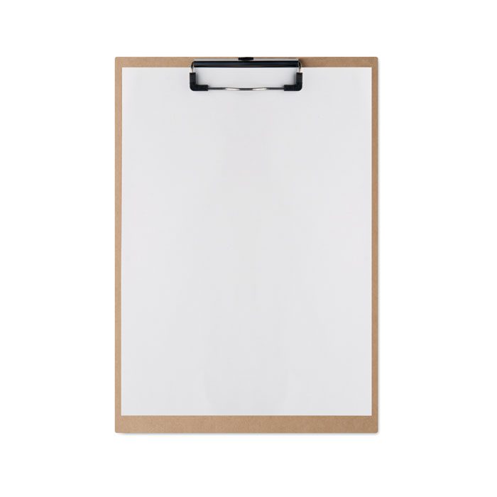 A4 clipboard made of cardboard with paper cover and silver iron clip. Lightweight 125g design, ideal for everyday office or school use.