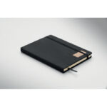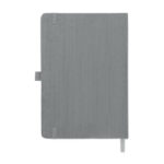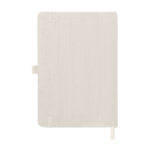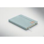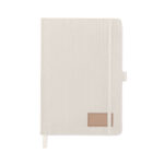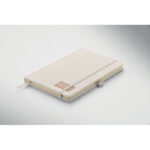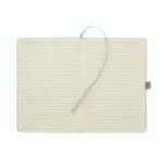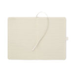 A5 notebook with hard RPET polyester corduroy cover and 192 lined recycled paper pages (70 gr/m2). Casebound design with elastic band closure, pen loop, ribbon page marker, and washed kraft paper tag.
