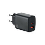 EU 2-pole GaN wall charger with 65W quick charge, 1 USB-A and 1 Type-C ports. Supports Power Delivery technology. Ideal travel item.