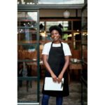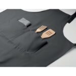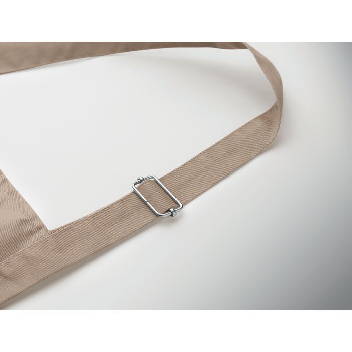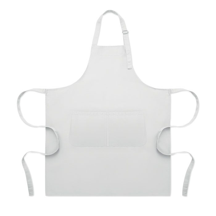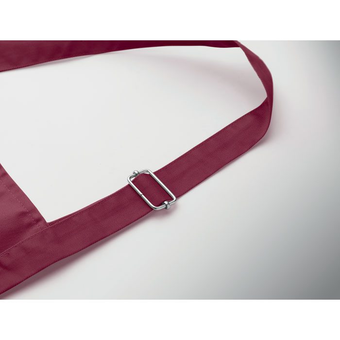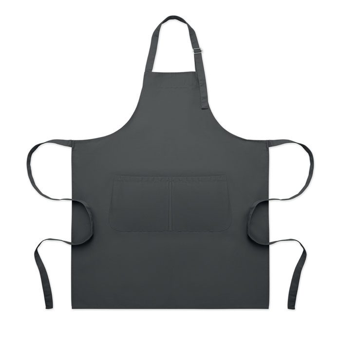 Long adjustable kitchen apron in 240 gr/m² polycotton (35% cotton, 65% polyester) with two front pockets and adjustable strap with metal buckle.