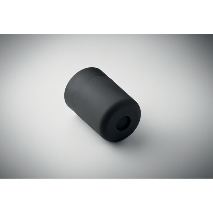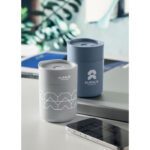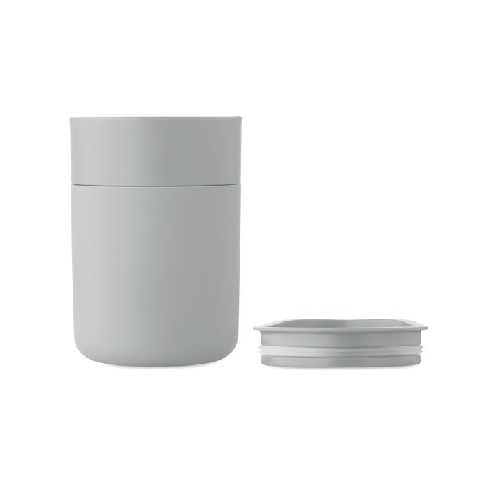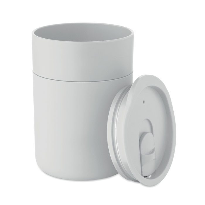 PP tumbler with silicone sleeve and PP sliding lid. Capacity: 330 ml. As this is a single walled mug, heat transfer can still occur.