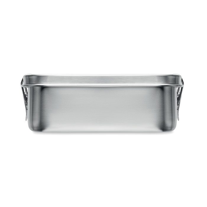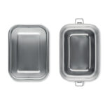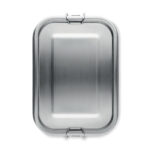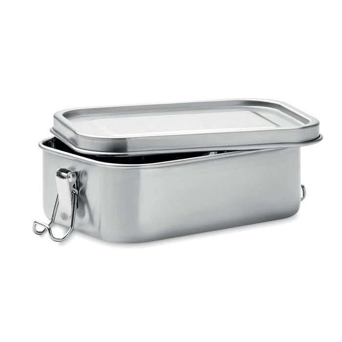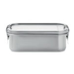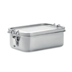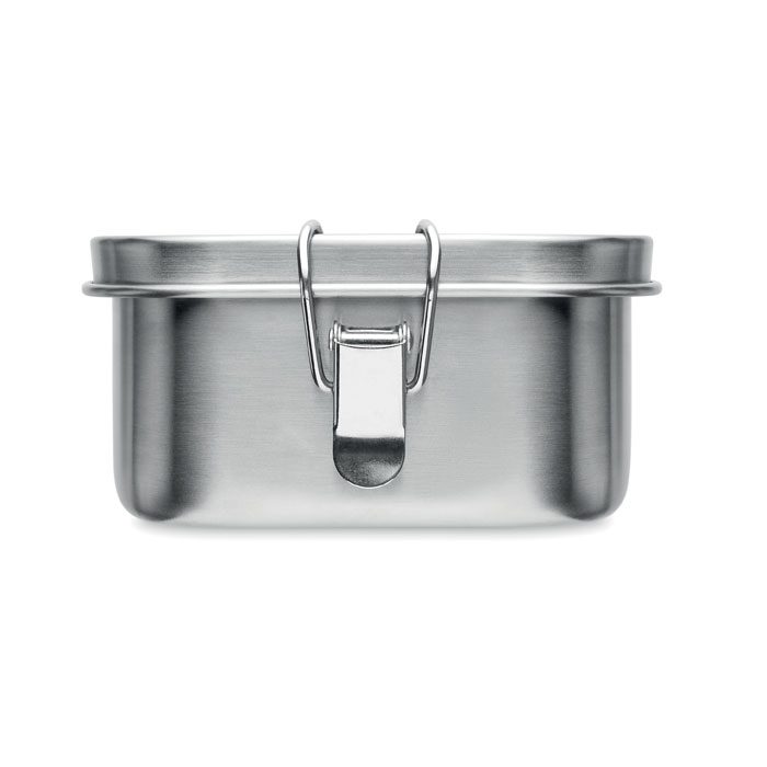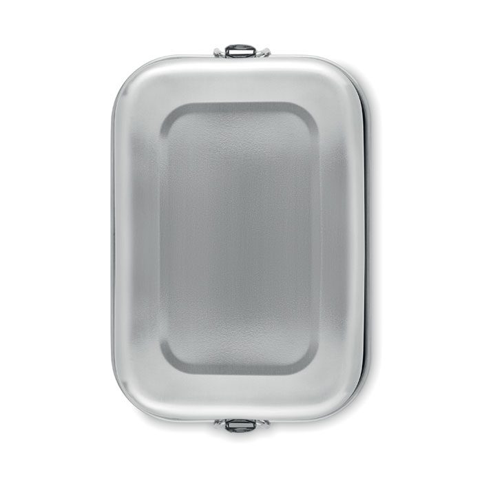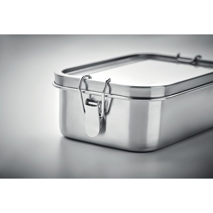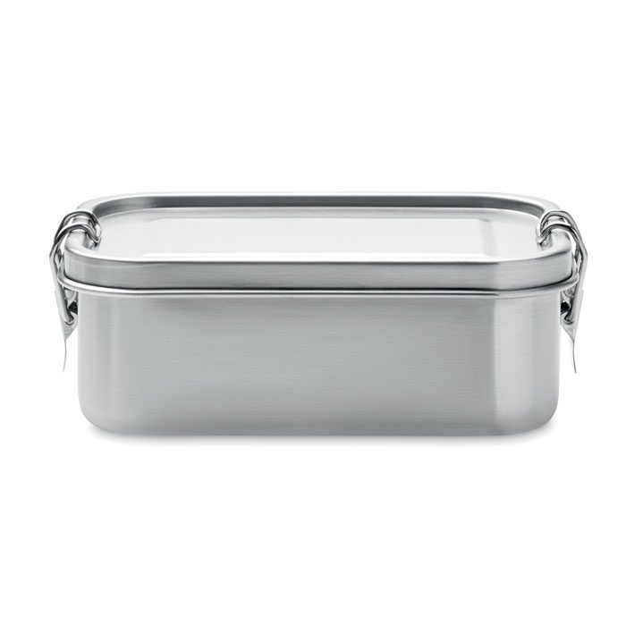 Recycled stainless steel (90 % recycled stainless steel and 10% stainless steel) lunch box with secure side buckles and round corners. Capacity: 750ml.