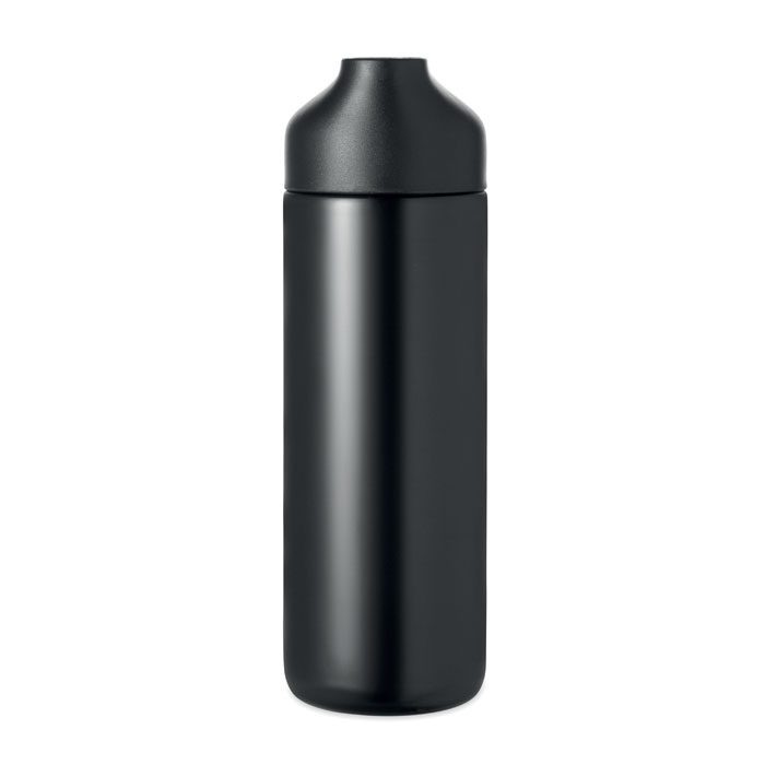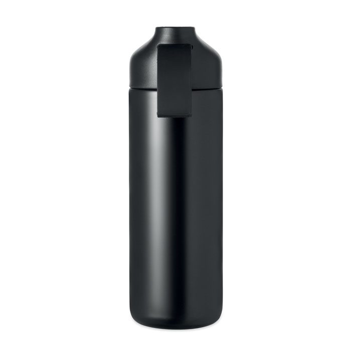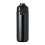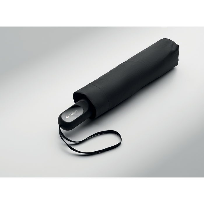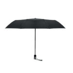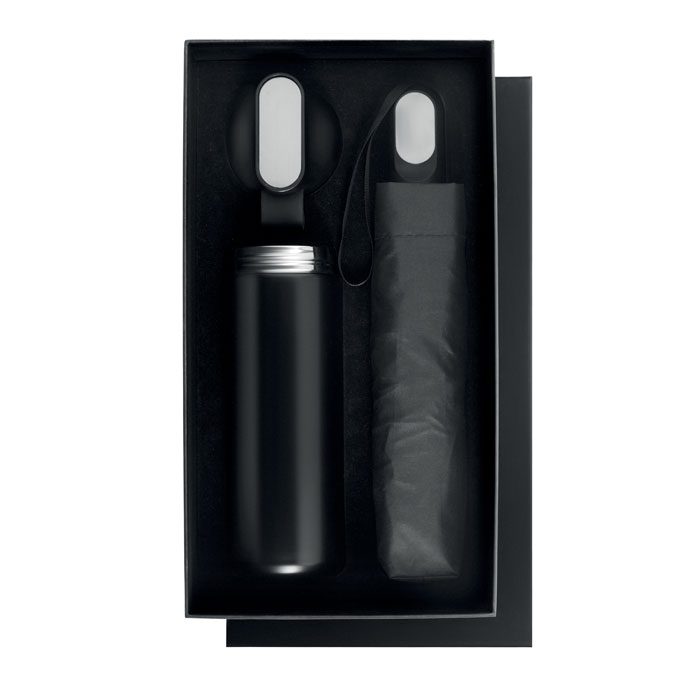 “2-piece gift set with 600 ml double wall recycled stainless steel bottle with PP lid, metal detail, and silicone handle, plus 21″” foldable windproof pongee umbrella with ABS handle in gift box.”