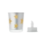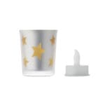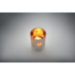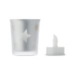 LED tea light in PP candle in glass jar. 1 button cell CR2032 battery included.