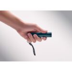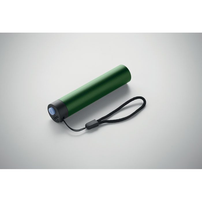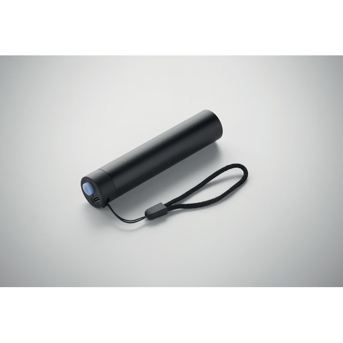 Recycled aluminium rechargeable torch 110 lumen with 3 light settings. 1 replaceable and rechargeable 14500 lithium battery 400 mAh.