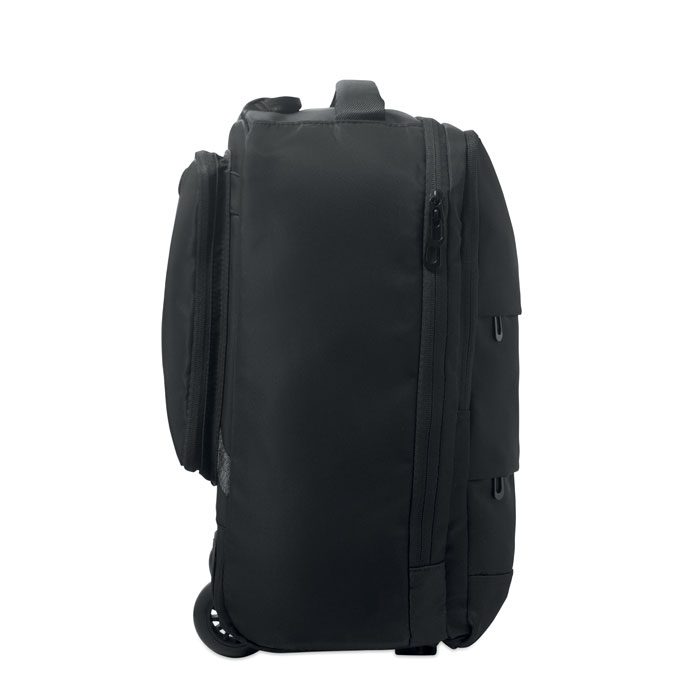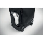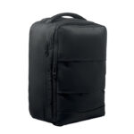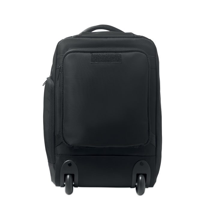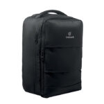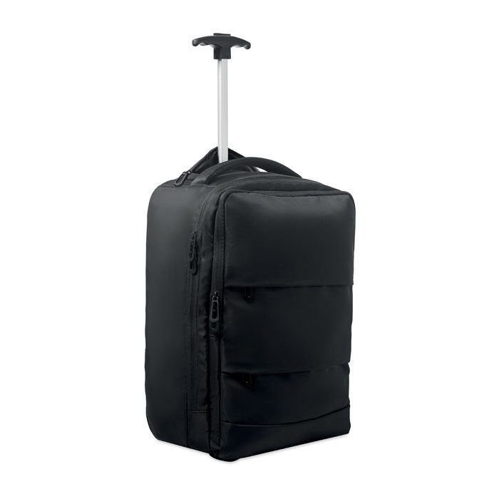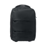 Backpack trolley in 290T RPET polyester with three front zip pockets, padded 15” ” laptop compartment, and zippered cooling section. Features padded back, straps, and rear zip strap compartment.