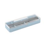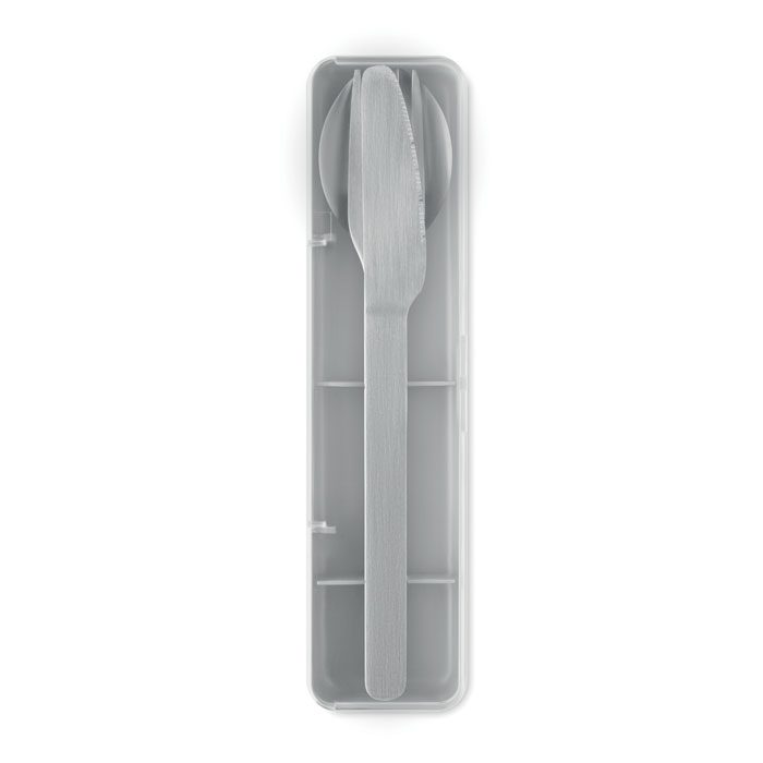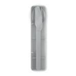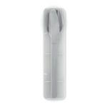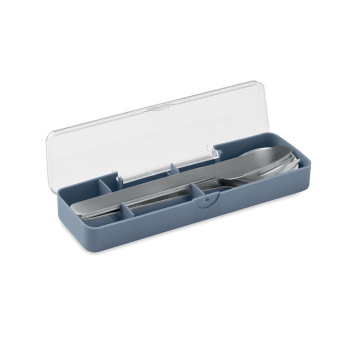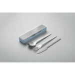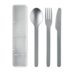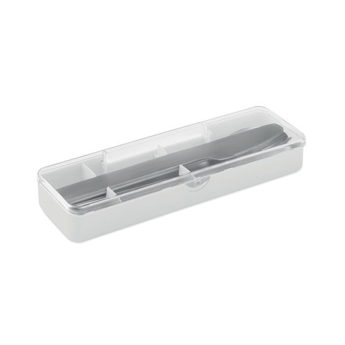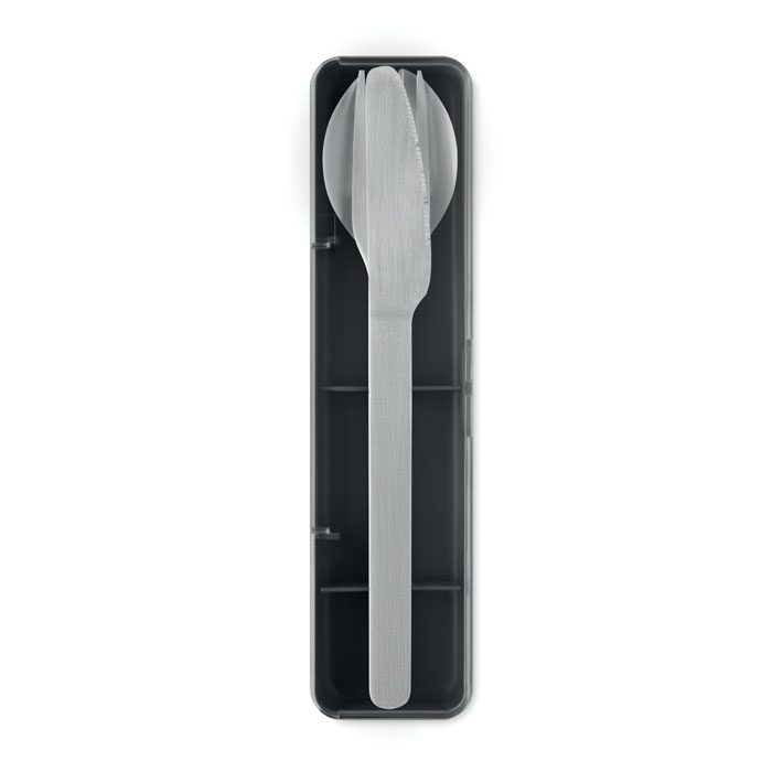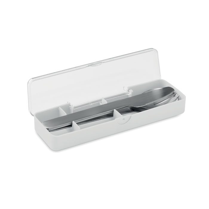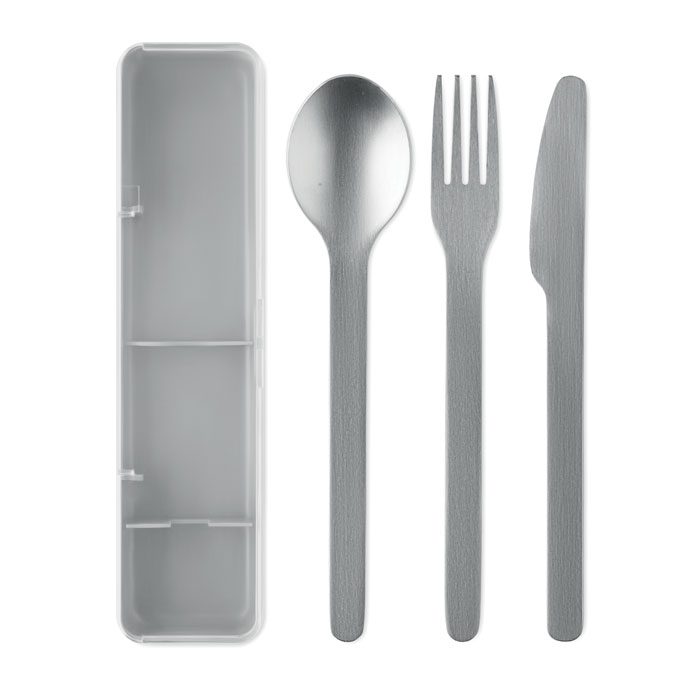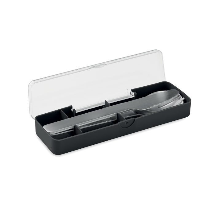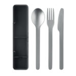 Stainless steel cutlery set with PP case. This set includes a fork, knife and spoon.