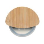 Round pizza cutter with bamboo handle and stainless steel blade. Features transparent white silicone protection ring.