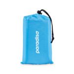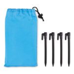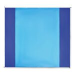 Lightweight beach mat in 210T polyester measuring 200x210cm. Includes 4 black hooks and a matching drawstring pouch for easy carrying.