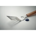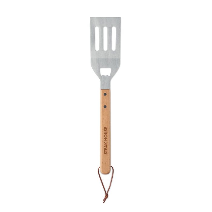 Stainless steel BBQ spatula with beechwood handle and integrated bottle opener. Includes PU rope hanger for easy storage.