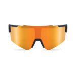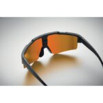 Sports sunglasses with mirrored lenses and black frame. UV400 protection.