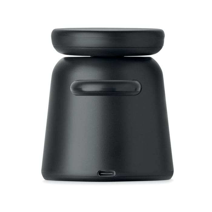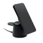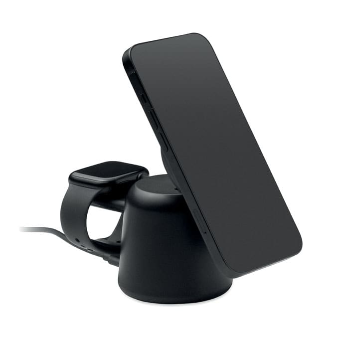 3 in 1 charging station in ABS. Includes 15W magnetic wireless charger for phone and TWS with phone holder functionality and smartwatch charger (iOS only). Magnetic feature compatible with iPhone® 12 and newer. Including additional magnetic metal ring to support charging of other non-magnetic wireless chargeable phones.