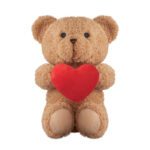 Polyester teddy bear plush holding a red heart, Embroidered eyes, nose and mouth.
