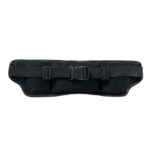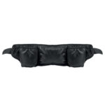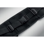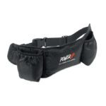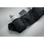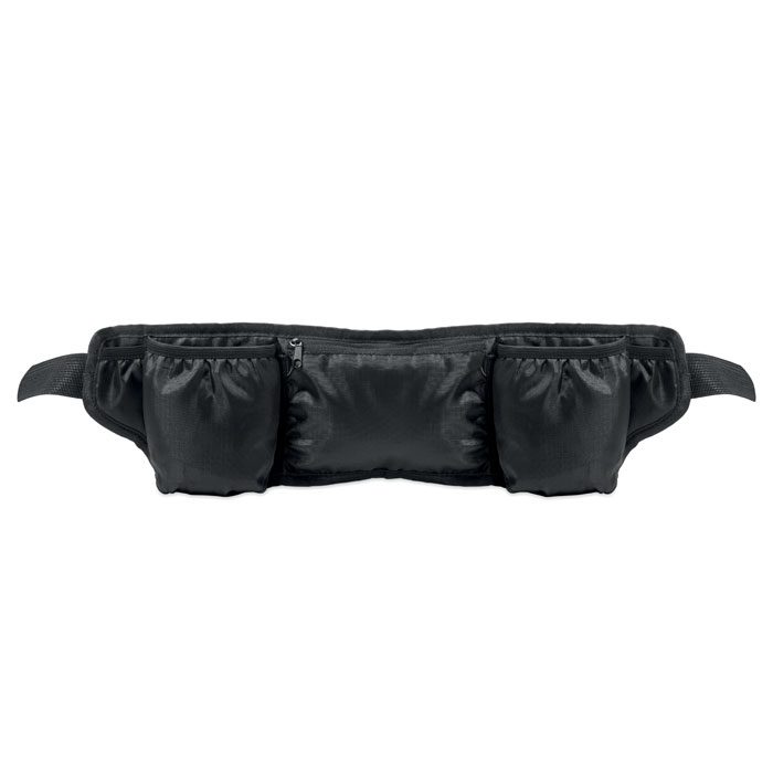 Sports running and hiking waist bag made of 420D RPET polyester with mesh back. Features two bottle compartments, central zip pocket, and adjustable strap. Lightweight and durable.