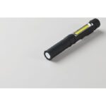 Magnetic LED work light torch in ABS with clip and side COB light. Features magnetic base for hands-free use. Requires 3 AAA batteries (not included).