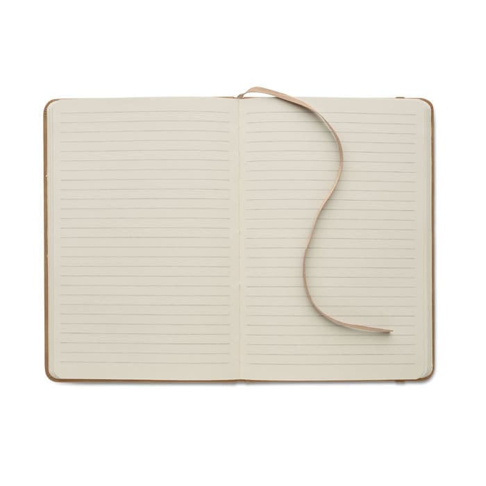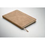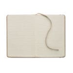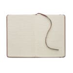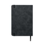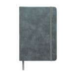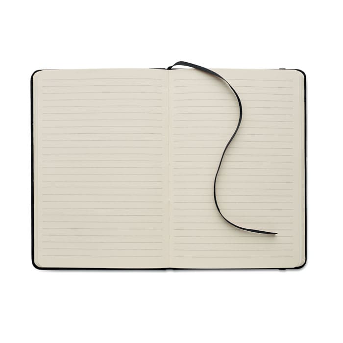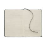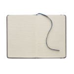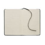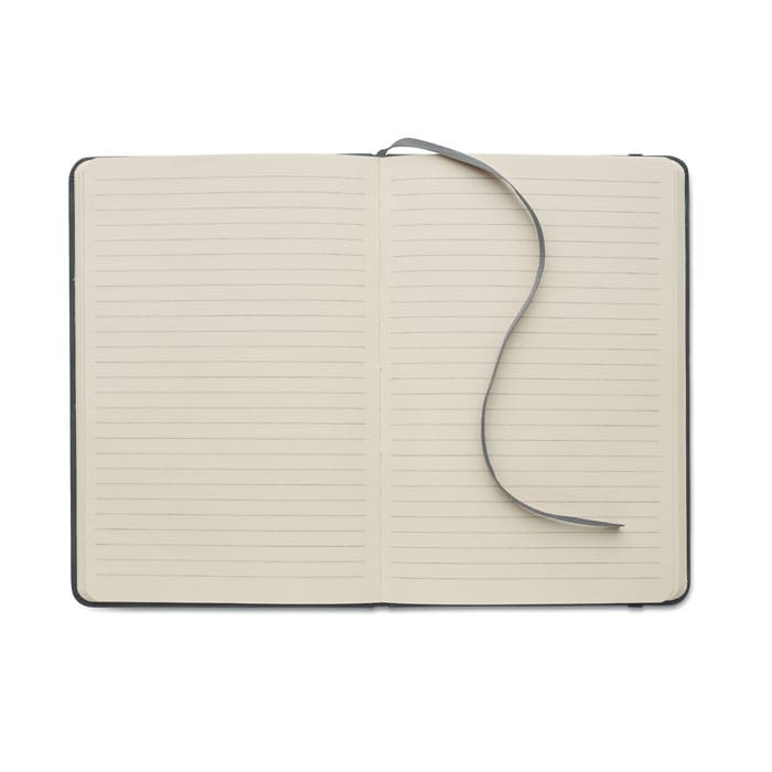 A5 notebook in 40% recycled post consumer smokey hard PU cover and 60% PU cover. Casebound. 160 lined pages, 70gsm recycled paper (80 sheets). Matching elastic closure strap and ribbon page marker.