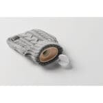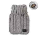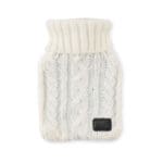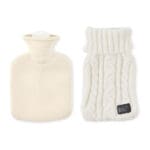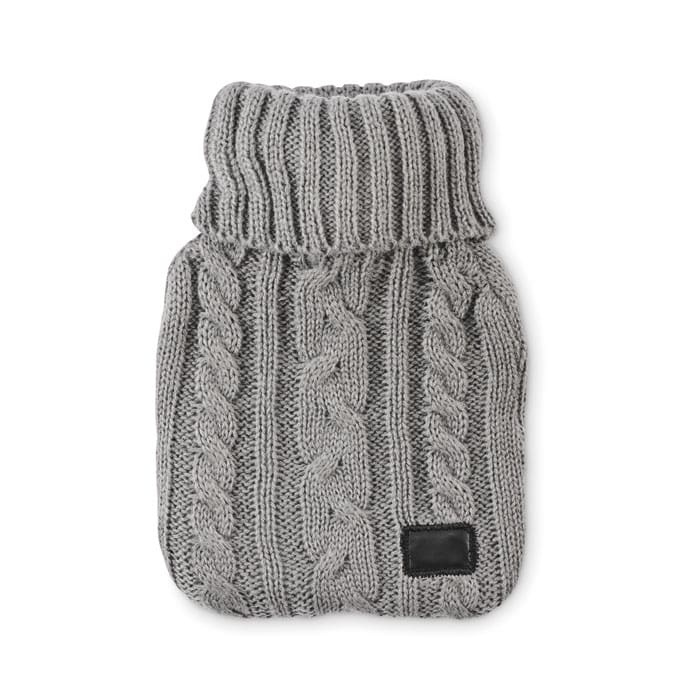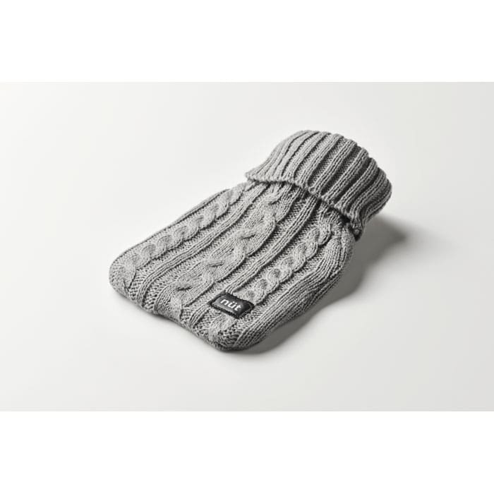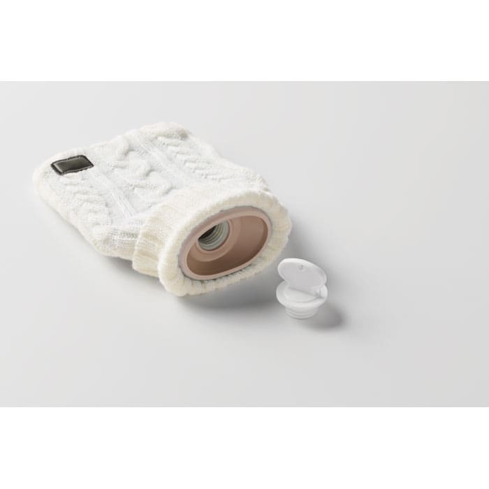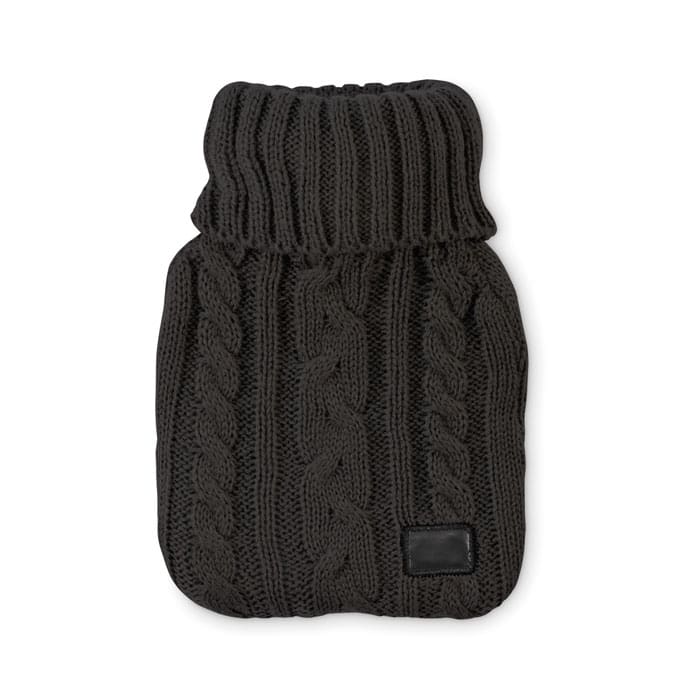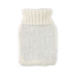 Hot water bottle with knitted acrylic pouch. Used to provide warmth, typically whilst in bed, but also for the application of heat to a specific part of the body. Capacity: 450 ml.