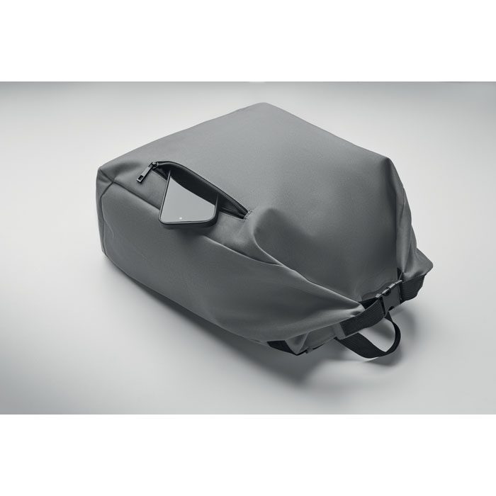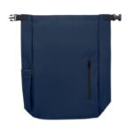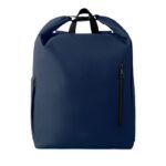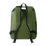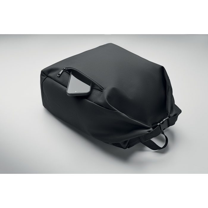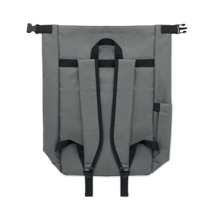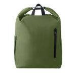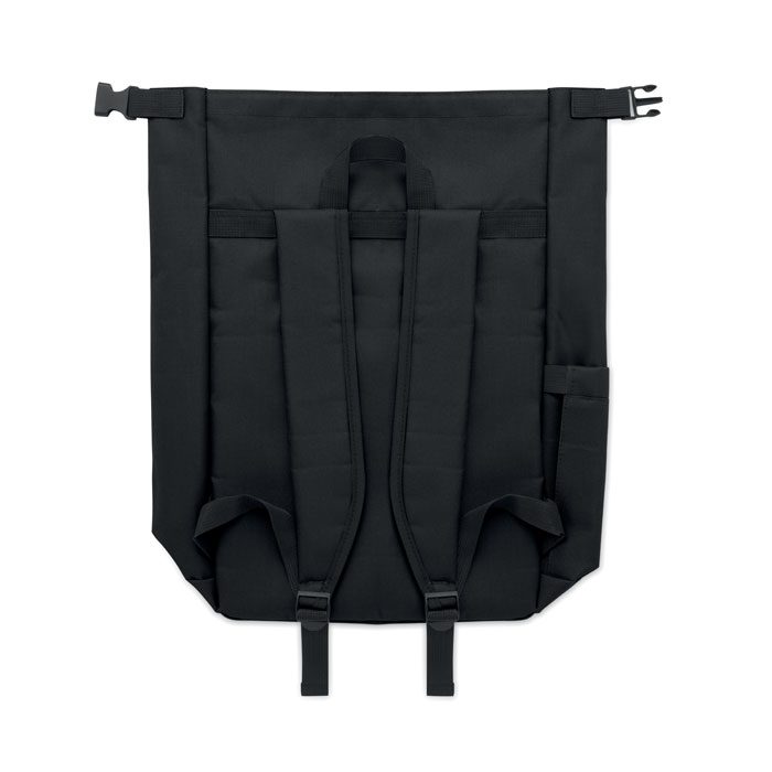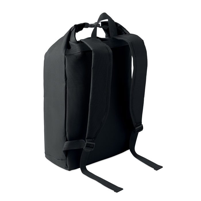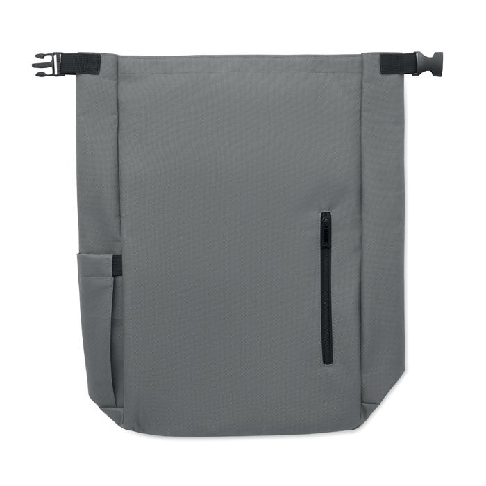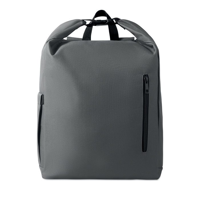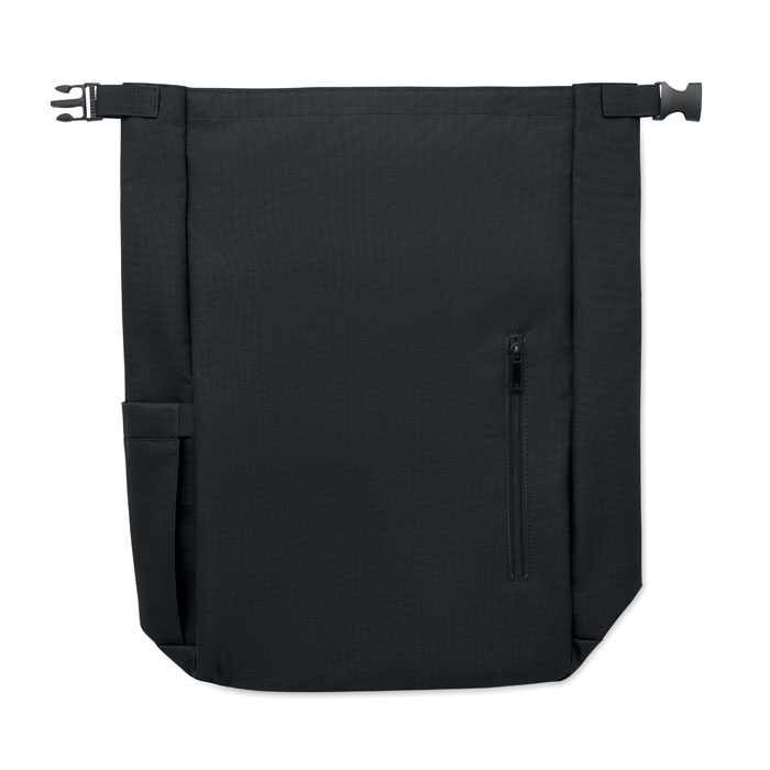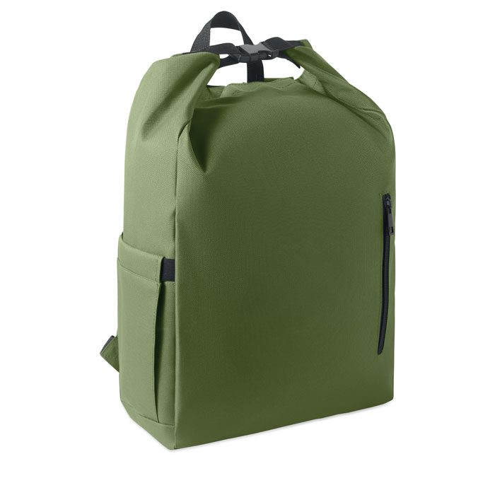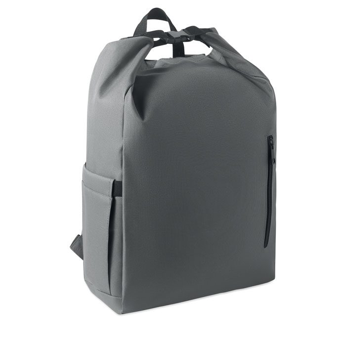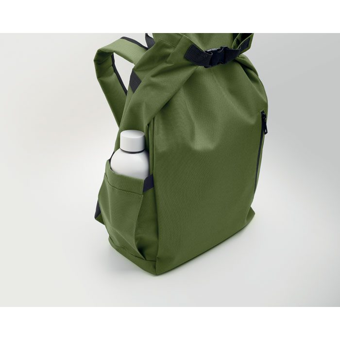 15-inch roll top laptop backpack made of 600D RPET polyester with 210D RPET padded lining. Features a zippered front pocket, elastic side pocket, and adjustable shoulder straps.