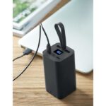 20.000 mAh power bank made of recycled aluminium with a digital power display and silicone hanger. Features two Type-C and two USB-A outputs with PD 65W fast charging.