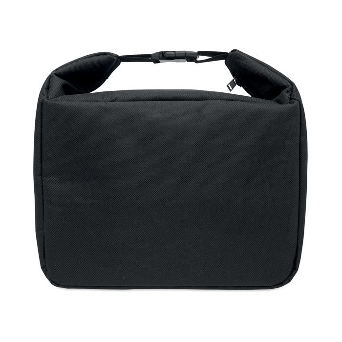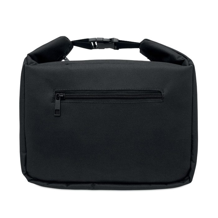 Cooler lunch bag with internal temperature indicator made of 600D RPET with 3mm PE foam with aluminium foil lining. Buckle closure. Zippered main compartment. With side zippered pocket. Capacity: 10L