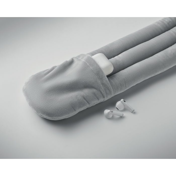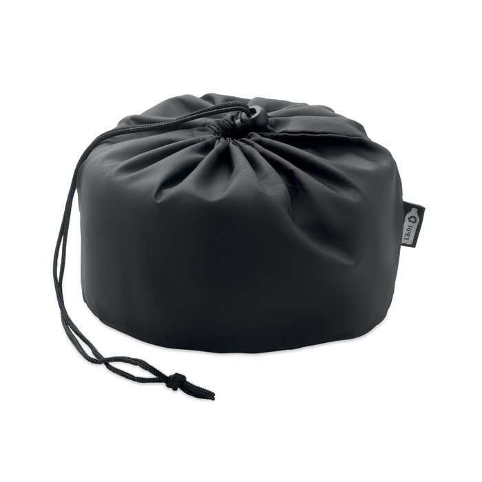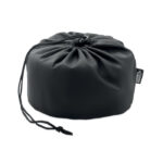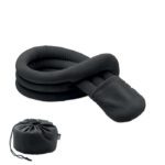 Bendable travel pillow made of soft polyester and foam. Includes RPET drawcord pouch for easy storage. Comfortable and compact for travel.