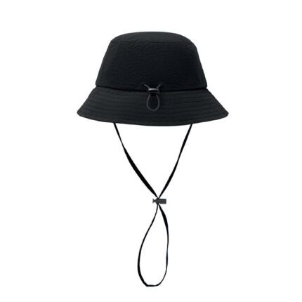 Knitted beanie with ear flaps and pompom in acrylic fibre with polyester and fleece lined. Includes label for printing area on one side. Adult size.